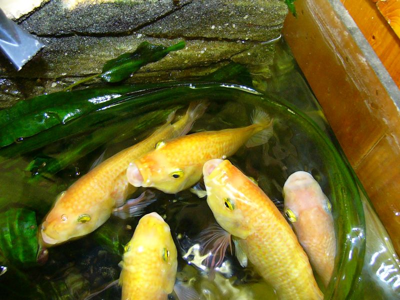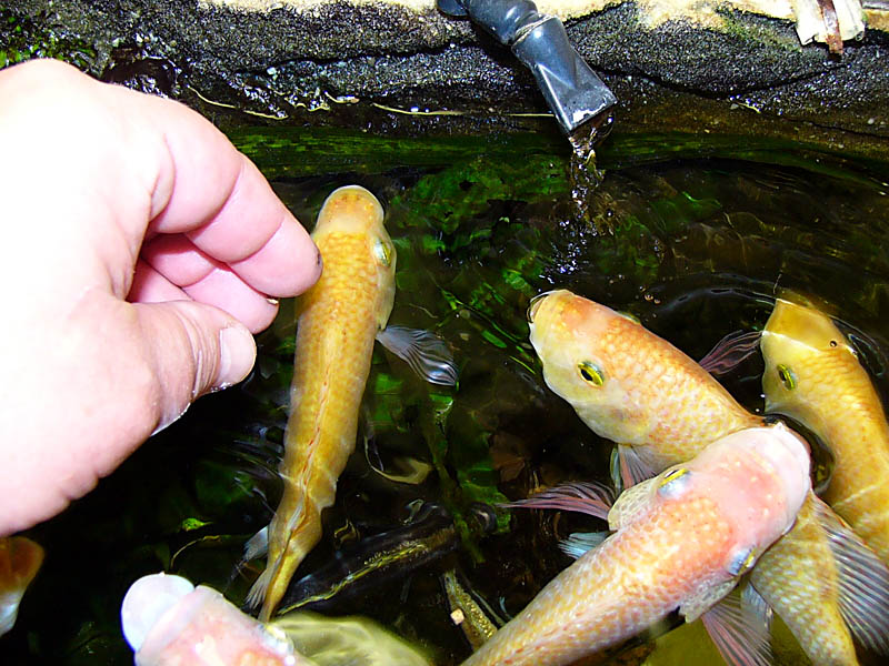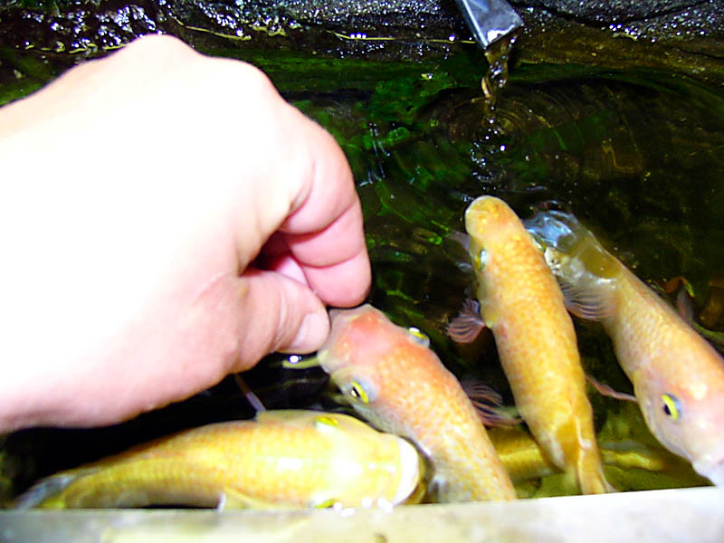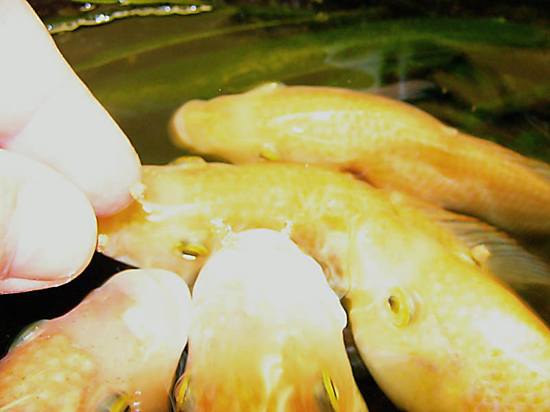 Tak tohle jsou moje "oráchlé" tilapie mossambické, nechají si sypat granule přímo do pusy a dokonce mají rády i podrbání na hlavě