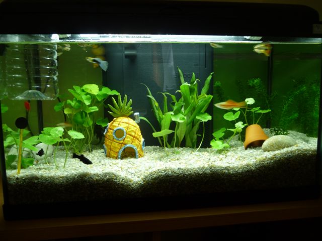 rostliny jsme meli 3ks s vyhodnky, takze jsem je vice rozsadila po akvariu at se citi ryby lepe... co se tyce poctu ryb mame jich asi 12ks na 54l male sorty jako napr.5 pavich ocek, parek kominicku,parek mecovek 3 prisavky,a jednu oranzovou malou rybku druh neznam..a sneka zluteho