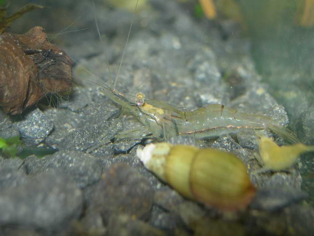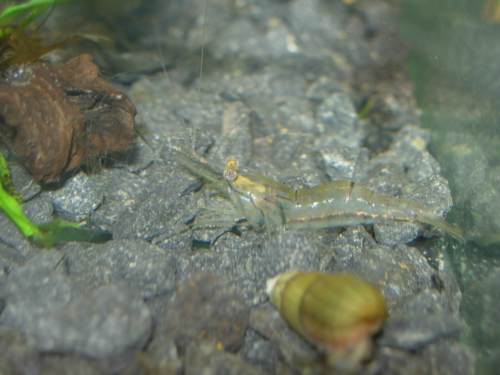 Tipuji to na Macrobrachium lanchesteri. Teď mají 2+ cm. Stáří neznám, koupil jsem dnes 4 ks, víc už nebylo:( Prodávali je pod názvem Caridina Crystal shrimp