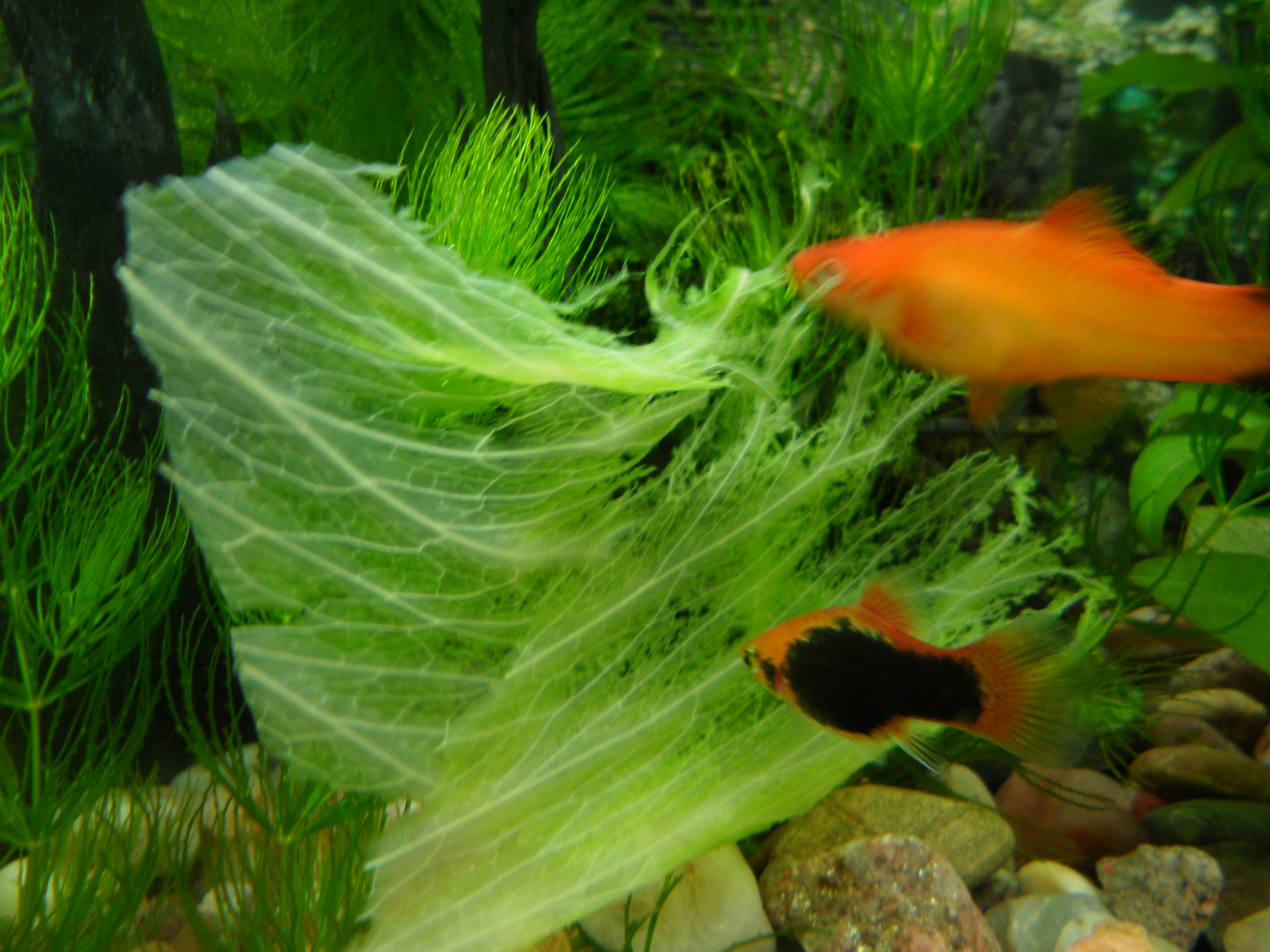 Je pravda,že ty čuzy oždubujou rostliny,hodil jsem jim tam salát a prdí na něj,zítra vyzkouším okurku.Jo a zapomněl jsem,že rybky ještě dostávaj tak třikrát do měsíce mražené patentky Fa Huml,žlutej obal.Ha,už žerou ten lupen salátu.