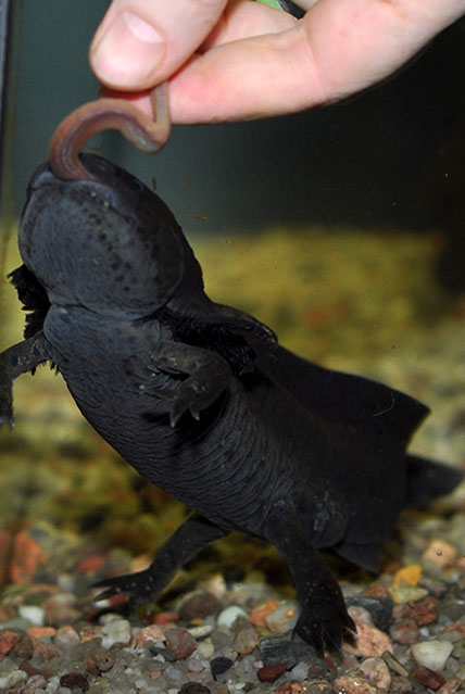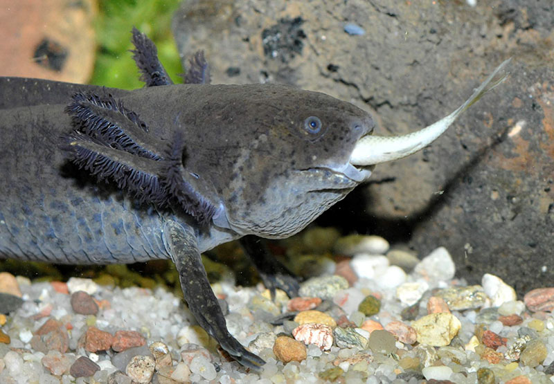Axolotly krmím celýma rybkama, žížalama, mouchama, občas červy. Změnit jídelníček opatrně, ne hned nacpat žížalama, spíš po troškách, po tak dlouhé monodietě by mohl mít problémy.
