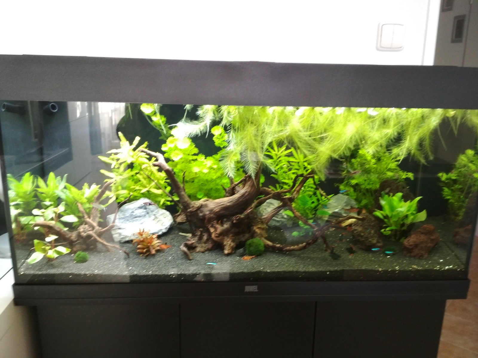 akva je 180l komplet od Juwelu s vnitřním filtrem 600l/h, světlo led zářivka 2x23w, měním každý týden zhruba 70l vody, voda je z kohoutku neodstátá, hned dávám regulátor vody easy-life aquamaker, přerybněno asi nemám tak 35 rybiček + ancistruse 5x + 6 pancéřovníčků, akvárko založeno v polovině srpna, takže 1,5 měsíce, hnojím dle návodu 2,5ml denně a carbo 3ml denně, přikládám foto celkového akva a děkuji za informace.