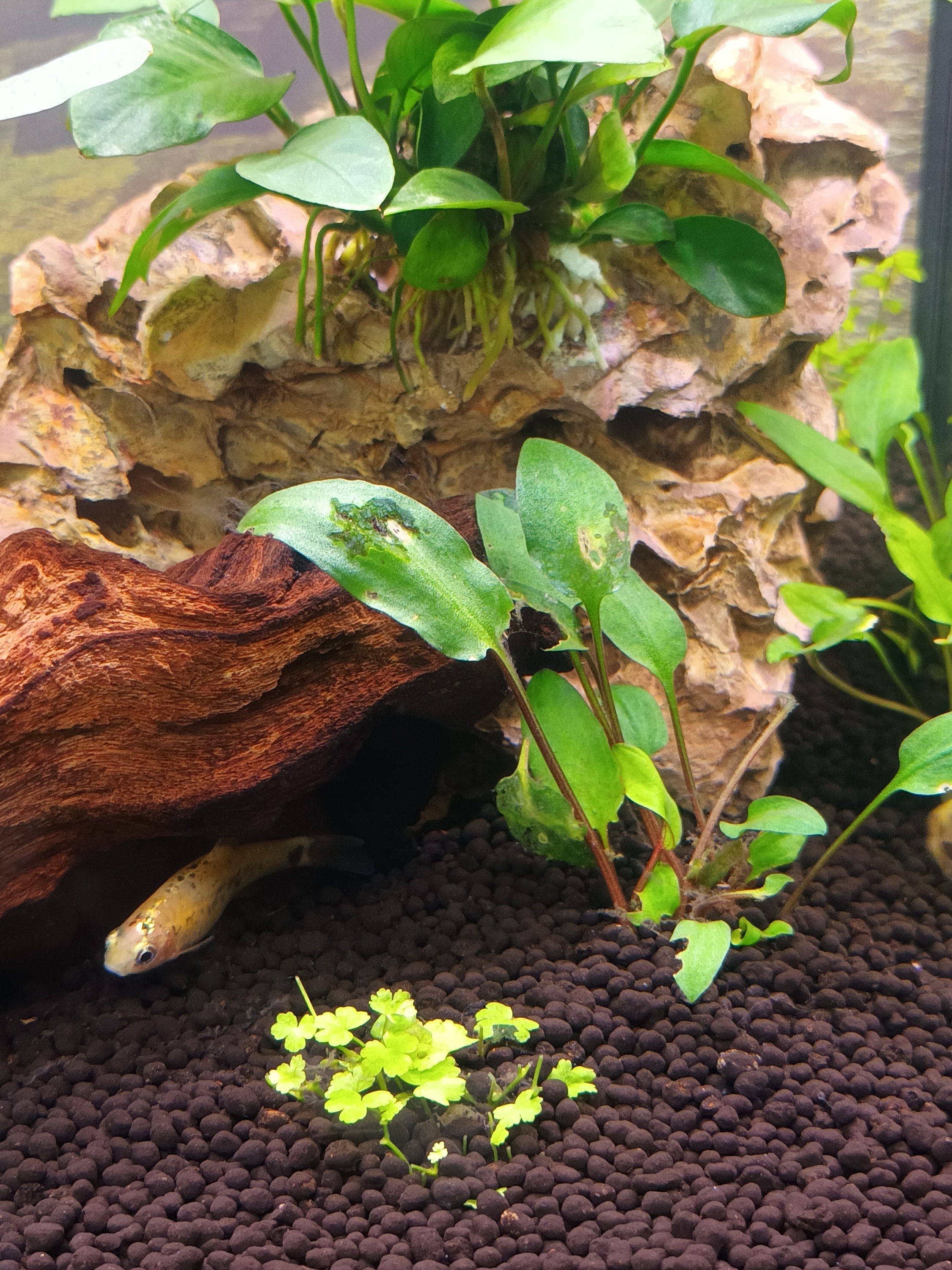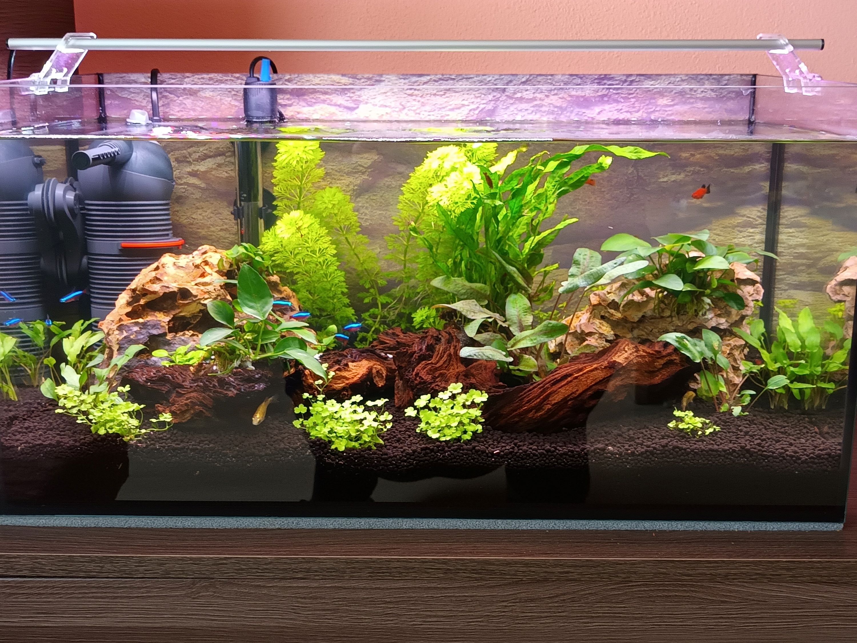 máme akvárium 4 týždne. Po 2 týždňoch zábehu sme doň kúpili rybky (prísavníky, neónky, mrenky a krevetky). V akvariu máme živé rastlinky, koreň a skaly. Svetlo je 20 w LED, ktoré máme nastavené na 40% 2 hod.doobeda a 2 hod.poobede. V týchto medziach je obsiahnutý 30 min. režim "sunrise" a 30 min. režim "sunset". Od napustenia vodou som podľa návodu pridával Seachem Stability 7 dní. Máme aj Planet Care Premium Nutrition, ktore sme zatial nepoužili. Ohrievač je nastavený na 23'C, filter čistím každý týždeň a vodu vymieňam rovnako. Akvárium nie je na priamom svetle. Rybky kŕmime 2x denne vločkami a peletkami. Cca po 3 týždňoch sa nám ale začali v pravej časti akvária na rastlinkách objavovať "pavučinky". Sú to riasy? Ak áno, ako sa ich môžeme zbaviť? Pripájam fotku celého akvária (pre predstavu) a 2 fotky s rastlinkami, na ktorých sa pavučinky vyskytlli. Na 1 fotke je to skôr "vata" vľavo od prísavníka a na 2. fotke su to spomínané pavučinky na dvoch rastlinkách v substráte na listoch aj stonkách.