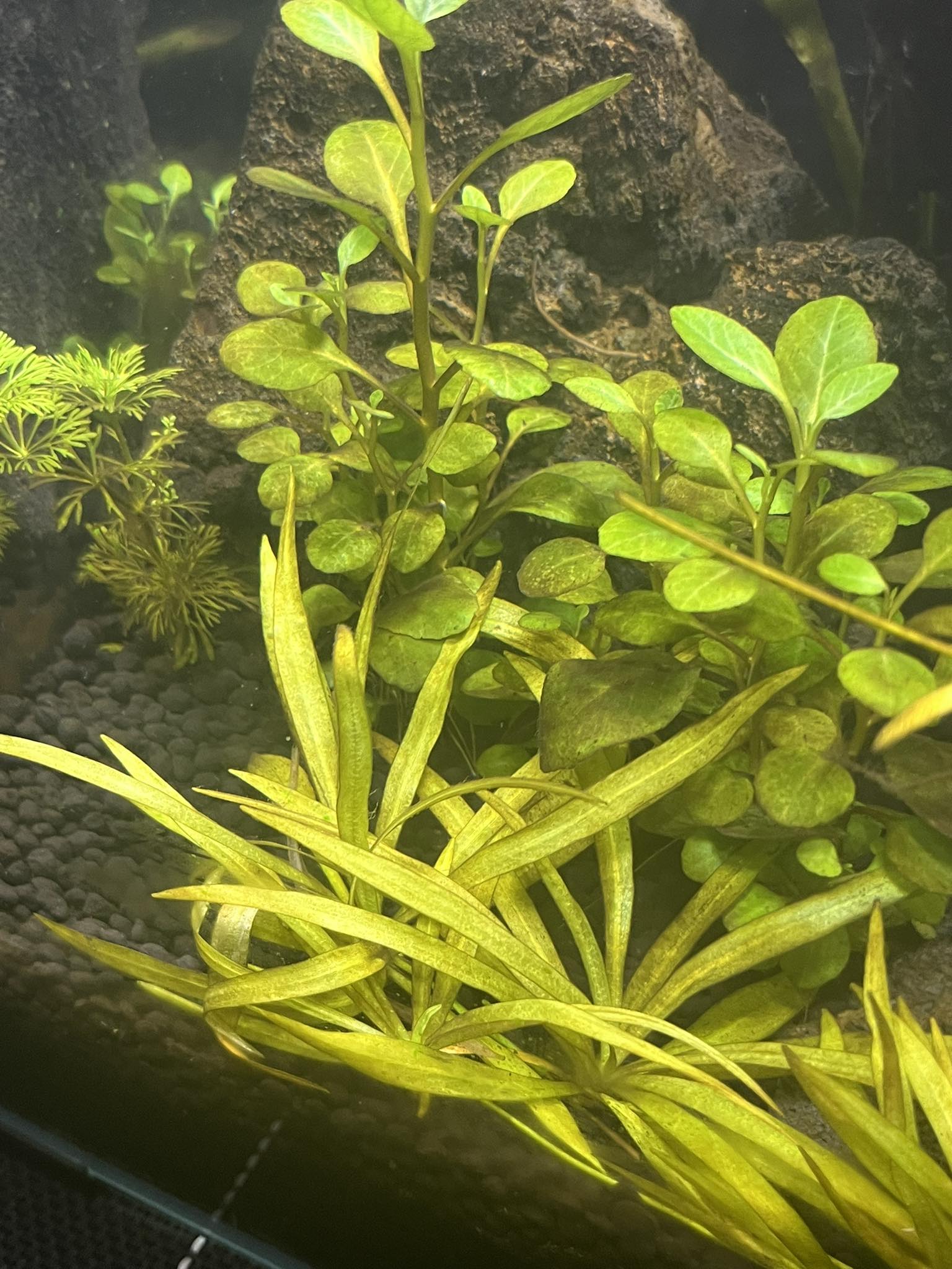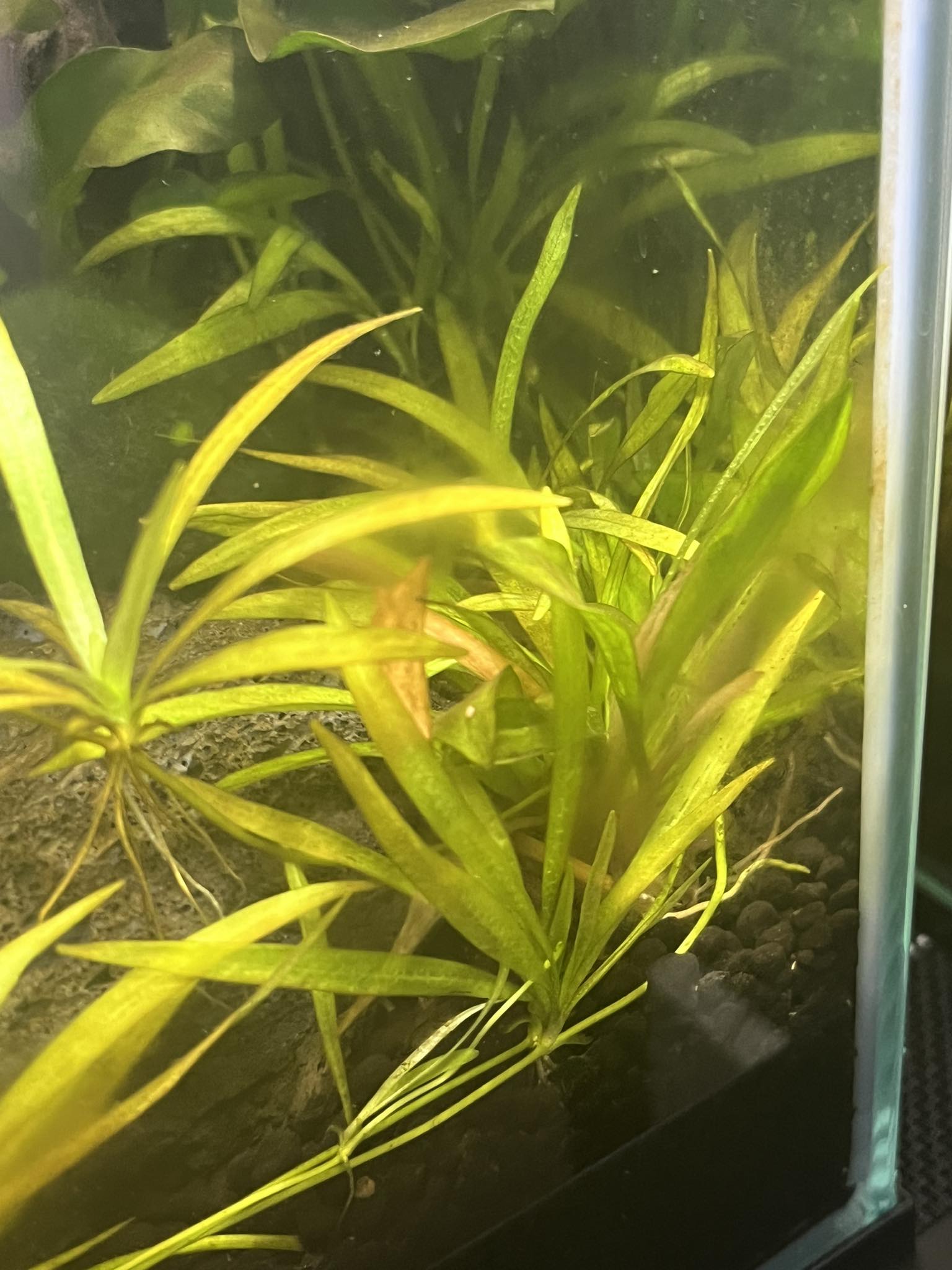 Jedná sa o hnedé až žlté zafarbenie rastlín, hnedá prachovitá riasa na sklách, dnes som si všimla i riasu na koreni, ktorá je vlásočnitá.